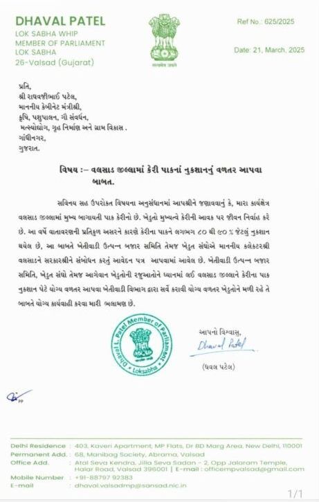 વર્તમાન વર્ષે વાતાવરણની પ્રતિકૂળ અસરને કારણે કેરી પાકને લગભગ ૮૦ થી ૯૦ % જેટલું નુકસાન થવા પામેલ છે, જે બાબતે ખેતીવાડી ઉત્પન્ન બજાર સમિતિ તેમજ વિવિધ ખેડૂત સંઘોએ વલસાડ જિલ્લા કલેકટરશ્રી અને સરકારશ્રીને સંબોધન કરતું આવેદનપત્ર પણ પાઠવ્યું છે, જેથી તેમની રજૂઆતોને ધ્યાને લઈ વલસાડ જિલ્લાને કેરીના પાકને નુકસાન પેટે ખેડૂતોને યોગ્ય વળતર આપવા ખેતીવાડી વિભાગ દ્વારા સર્વે કરાવી યોગ્ય વળતર ખેડૂતોને મળી રહે તે બાબતે યોગ્ય કાર્યવાહી કરવા માટેની લેખિત રજૂઆત સાંસદશ્રી દ્વારા કરવામાં આવી છે